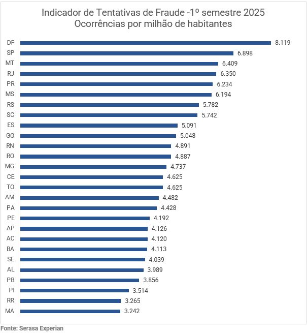 Quando analisada a proporção de tentativas de fraude por milhão de habitantes (indicador que revela a intensidade dos ataques em relação à população exposta), o Distrito Federal apresentou a maior taxa nacional: 8.119 ocorrências por milhão. São Paulo e Mato Grosso apareceram logo em seguida, com 6.898 e 6.409, respectivamente, reforçando o alcance generalizado das ações criminosas, independentemente da localização geográfica. Confira no gráfico abaixo a taxa de exposição por UFs: