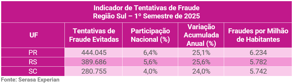 O Sul do país registrou 1.114.486 ocorrêncials golpistas evitadas no primeiro semestre de 2025. O Paraná liderou com o maior volume de diligências barradas (+444 mil), seguido do Rio Grande do Sul (389 mil) que também demonstrou a maior variação anual do período. Santa Catarina apresentou o menor valor no período (280,7 mil). Os dados são do Indicador de Tentativas de Fraude da Serasa Experian. Confira na tabela abaixo o detalhamento das Unidades Federativas (UFs) da região: